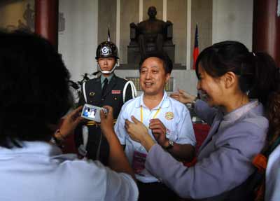 两岸周末包机四日启动,广州首发旅游团抵台后即前往台北“国父纪念馆”参观,正好看到三军仪队表演,感到很兴奋,手中相机拍不停。