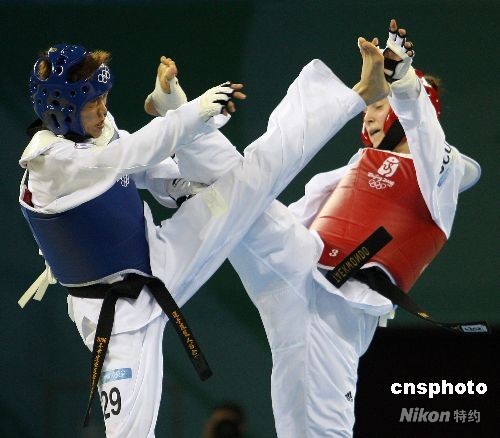8月21日,北京奥运跆拳道女子57公斤级比赛在北京科技大学体育馆举行,在铜牌争夺赛中,中华台北队苏丽文(蓝方)不敌克罗地亚选手。中新社发 CNAsports 摄
