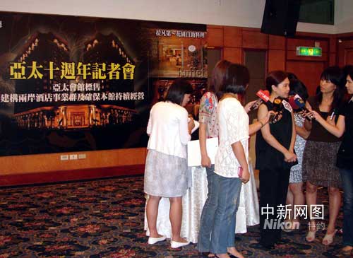 台湾威京集团旗舰馆亚太会馆八月二十七日喜迎建馆十周年。威京集团在两岸商业、农业休闲、不动产开发、商务饭店均有投资和拓展,馆庆吸引众多媒体关注。图为亚太会馆董事长特助唐亚君在回答记者提问。作 者:曾福志