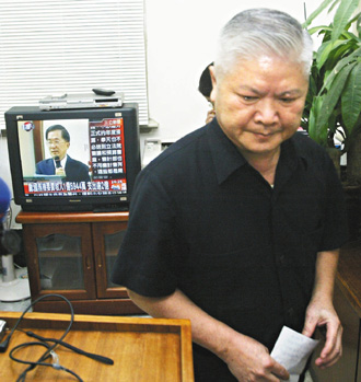 陈水扁昨天下午举行记者会的同时,特侦组主任陈云南也举行记者会,并同步收看电视,了解陈水扁的说法。(台湾《联合报》图)
