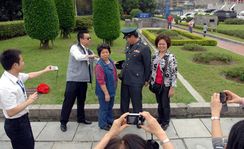中新网4月21日电 据“中央社”报道,台北中正纪念堂前的“自由广场”21日在举行欢迎军礼后,涌进一批大陆观光客,大家都要求与尚未离去的台军官兵合影,还要求借戴军帽,也有游客忙着和行进中的三军仪队合影。