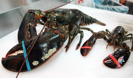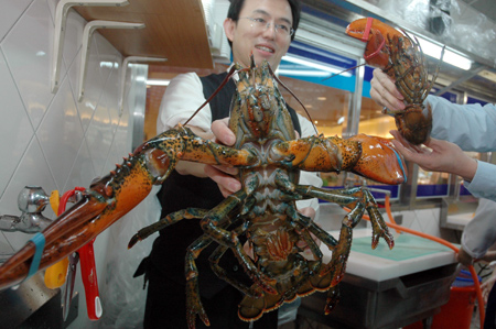 中新网4月24日电 据“中央社”报道,龙虾的前螯是老饕最爱,台北县超市23日从加拿大引进海鲜之王2772公克超级大龙虾,依体重估计有近80岁年龄,堪称“人瑞”,一旁小龙虾有如小巫见大巫。