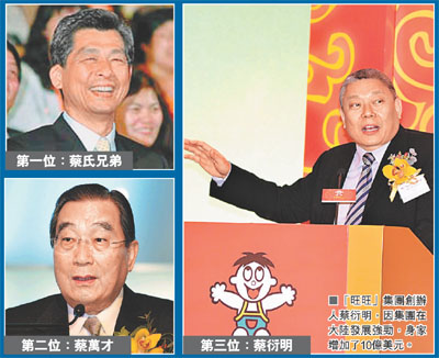 今年上榜富豪中仅5人录得资产增长,当中3人得益于大陆业务发展。“大赢家”是旺旺集团创办人蔡衍明,集团在大陆发展强劲,身家急涨10亿美元,排名从第9名跳升至第3名。另一食品集团康师傅的创办人魏应州,身家也大增5.5亿美元,升至第5名。