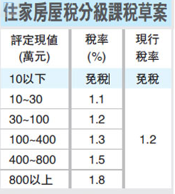 根据“财政部”所拟草案,房屋评定现值在10万元以下者,仍维持免税;超过10万元以上的住家用房屋,房屋税将分为五级课税,税率分别是1.1%、1.2%、1.3%、1.5%及1.8%。