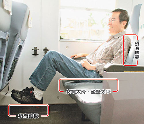 报道还说,但造成腰酸背痛的关键在缺乏“腰靠”。郭守穗指着自己腰部与座椅间的空隙说,座椅设计“腰部支撑最重要”,若椅子无法支撑腰脊就易生疲劳,而“太鲁阁”号就没有腰靠,坐起来就累。