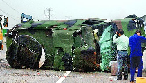 资电作战指挥部表示,这辆车十月二十六日到位于桃园的“中科院”进行年度定期保养,昨自返回中部驻地时,行经南下彰化路段时,疑因左后轮刺到尖锐物爆胎翻车,所幸驾驶兵及随车的士官长毫发未伤。不过,士官长陈俊典见记者采访时,猛挡记者镜头并拿相机反搜证指称:“这是通讯车恐怕会有外泄问题,希望不要拍摄!”