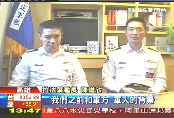 中新网1月15日电 据TVBS报道,台湾海军一级巡防舰艇“拉法叶舰”,有一对同时服役的舰长是兄弟俩,创下台湾海军史上的纪录。现年43岁的陈道欣和他的弟弟,41岁的陈道辉,先后加入海军,哥哥在2008年9月当上舰长,而弟弟3个月后,在同年12月也当上舰长。