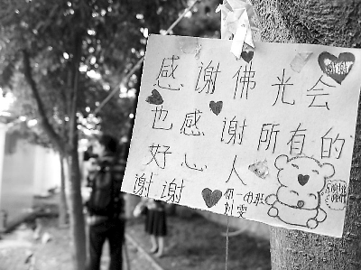 5月5日,采访团走进四川江油市彰明中学,正对大门的主教学楼正在赶工,但已初具宏伟外观。校园内的花坛里、树枝上挂满五颜六色的千纸鹤、纸百合和卡片,上面写着学生的感恩和憧憬。一张卡片上写着:“感谢佛光会,也感谢所有好心人。”