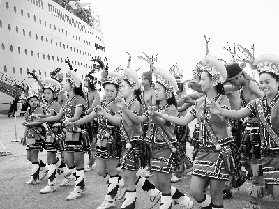 13日,安利团员乘坐的邮轮停靠花莲港口。早晨7时,已经有花莲原住民阿美族的姑娘小伙身着盛装,在港口用歌声和舞蹈欢迎大陆来的客人。