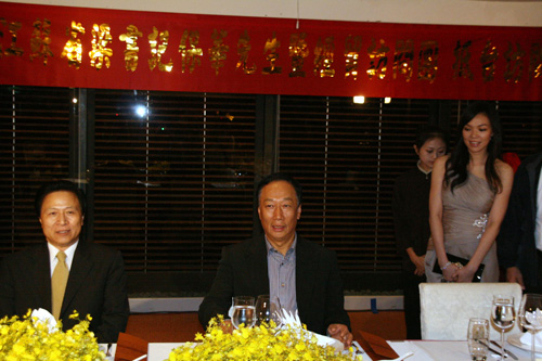 梁保华所带领的大陆江苏省经贸考察团,晚上6时30分在涵碧楼湖光轩餐厅接受郭台铭的晚宴,陪同的台湾政商人士包括国民党副主席林丰正、全台工业总会理事长陈武雄等人,计有两岸代表约50人参加。