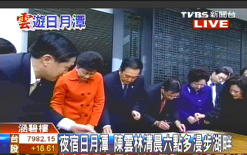 陈云林今天清晨6点多,先是邀约江丙坤共进早餐,后来又漫步在日月潭湖畔,欣赏美丽的风光。