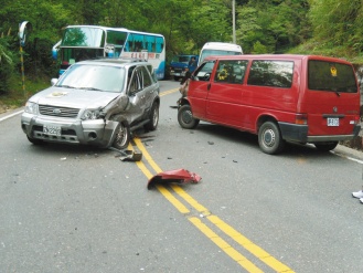领队边雯雯和多名团员提说,车子开到下山右弯道时,对向车道突有辆休旅车想超过游览车,开到他们的车道上,两车都急忙转向,他们搭的小巴车头往左转向,还是和休旅车的左侧车头擦撞;同团第二辆小巴煞车不及,追撞到第一辆小巴,造成第一辆小巴的8名游客,第二辆的2名游客受伤。