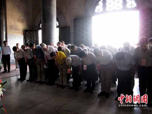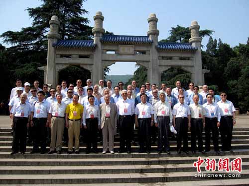 今日的南京睛空万里,艳阳高照。两岸退役将军们平均年龄已近古稀,许多都已是耄耋之年的老人,沿着392级台阶而上,挥汗如雨却不轻言退却。累了,彼此搀扶着坚持登阶而上。最终40余位将军在孙中山坐像前共同三鞠躬。
