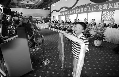 手捧洁白的哈达、红艳艳的羌红,伴随《四川欢迎您》的激越旋律,来自成都、德阳、绵阳、广元、阿坝、雅安6个汶川地震重灾市(州)的负责人李春城、方小方、吴靖平、罗强、侍俊、徐孟加,抗震救灾小英雄林浩、藏族艺人容中尔甲、羌族艺人苟利芝,走到台湾救援队、医疗队代表面前,向他们献上灾区人民最诚挚的祝福。