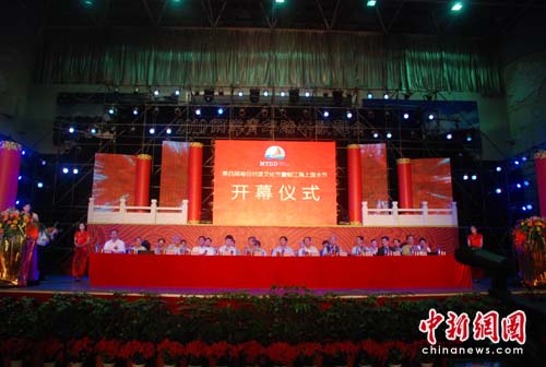 中新网石狮6月17日电(林永传 郭斌)16日是中国传统端午佳节,也是闽南所称的“五月节”。当晚,第四届闽台对渡文化节暨蚶江海上泼水节开幕式在福建石狮市体育馆举行。