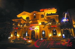 从珠江南岸向北岸远远望去,这幢新装修的酒吧格外醒目,建筑屋顶竖起的“HEIHEICLUB”和“喜喜”招牌上,霓虹灯的装饰闪闪发光。而在建筑的北面墙体上,整幅墙体布满酒吧的招牌。很难相信,这样一幢充满商业气氛的建筑,就是昔日肃穆的黄埔军校驻省办事处、黄埔军校同学会、中国青年军人联合会旧址。