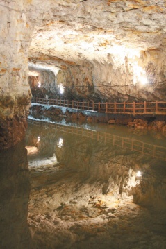 坑道内最著名的景观就是岩壁的水中倒影,投射在平静无波的水面后,形成另一座坑道,加深坑道高度的错觉,相当壮观;岩壁上还有许多当年以空压机打出的火药洞,显见当时开凿的难度。
