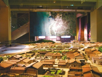 2楼望安乡中社村模型以30比1的比例壮观呈现花宅古聚落全貌,在文史任务者曾文明指导下,模型里每一座古厝与街景都经过考证与实景相符,澎湖县文化局长曾慧香形容这是“世界级”的古聚落模型。