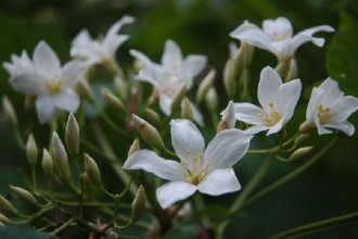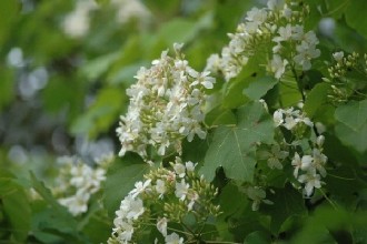 油桐树开的花,被爱花人昵称“桐花”,花开时白花成簇堆聚绿叶上头,有如冬雪轻覆枝头,加上花朵随风吹飘落,模样更像是雪花,因而赢得“夏雪”美名,虽然四月便见桐花开,但因盛花期落在五月间,又有“五月雪”的封号。