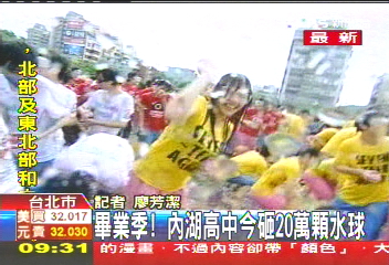 中新网5月20日电 据台湾TVBS报道,每年一到毕业季,最引人注目的就是内湖高中传统的砸水球,今年学生们准备了20万颗水球,歌手郭采洁也来献唱,现场好不热闹。