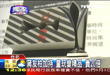 中新网5月14日电 据台湾TVBS报道,蒋家后代蒋友柏设计过许多产品,目前正式跨足台湾玩具市场。蒋友柏花了2年时间,设计了包括毽子、竹蜻蜓等一系列儿童玩具,用PVC材质制作,造型非常时尚,也因为有了蒋友柏加持,一个小玩具居然要卖590元新台币。