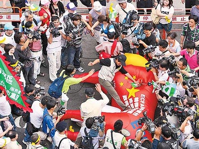 在台北游行的一些绿营民众因不满马英九与大陆签署经济合作架构协议(Economic Cooperation Framework Agreement,ECFA),准备了红色巨型充气马玩偶,上面画有我五星红旗标志,还写着“ECFA倾中卖台”等文字,并煽动民众踢踹泄愤。