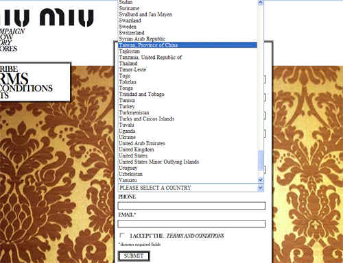 中新网6月5日电 据台湾TVBS报道,知名咖啡连锁店日前才因为网页把台湾列为中国一省遭到岛内一些消费者发动拒买抗议,现在又传出意大利高级皮件品牌MIUMIU,在官网订阅电子报里的国家栏,将台湾列为中国一省。对此,绿营又拿出来说事。
