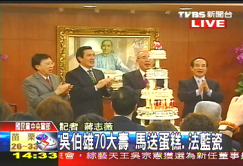 庆祝吴伯雄70岁大寿,包括马英九、刘兆玄、王金平等人都到场致贺,给足面子,而马英九也送上5层楼高的蛋糕,以及一个上面写着“伯雄中兴”的法蓝瓷,国民党“立委”洪秀柱更献吻祝福。