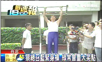 有人亏他怎么会穿体操裤配皮鞋?有人笑他堂堂绿营总召,怎么可以穿代表国民党的蓝色?蔡同荣则急着澄清结果,又自己爆料,那条紧身裤原来还是去订做的,现场笑成一团。