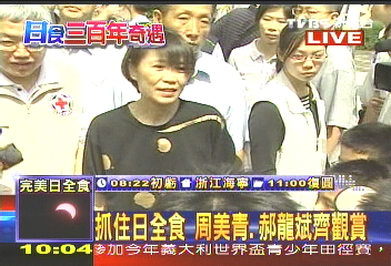 中新网7月22日电 据台湾TVBS报道,本世纪最长的日全食22日上午登场,虽然台湾地区只能看到约83%比例的日偏食,但已经让民众趋之若骛。在天文馆有现场观测站,马英九夫人周美青、台北市长郝龙斌也到现场一起观赏。