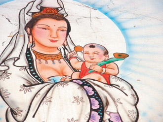 中新网7月23日电 据台湾联合报报道,台湾新竹县竹东镇惠昌宫天棚壁画有一帧“观音送子图”,观世音露出半边酥胸的造型。对此,文史工作者批评在庙宇画这么“清凉”的图画,“对神明不敬、不伦不类”,庙方说没有信众反映不妥,尊重创作者的想法,只要不违反善良风俗就好。