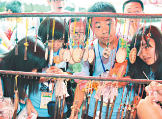 汶川地震灾区中学生26日到南投地区参观,921地震后居民学习手工艺创作,最吸引学生的注意。图片来源:台湾《联合报》