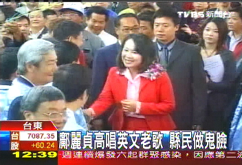 中新网7月31日电 据台湾TVBS报道,台东县长邝丽贞为争取下一届县长提名,忙得焦头烂额,有民众拍到,她到台东一家知名的风味餐厅高唱英文老歌,把台下观众逗得哈哈大笑,还把影片放上网。