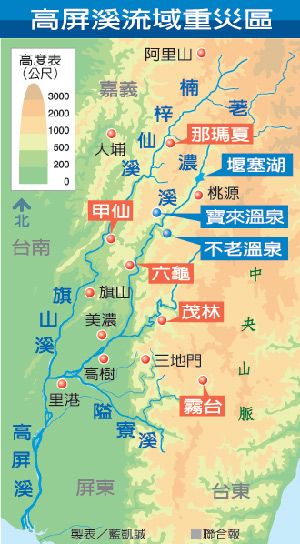 桃源乡堰塞湖溃堤,也危及屏东县高树乡沿岸村落,屏东县府昨天深夜广播要村民“赶紧往高处撤离”。超过上千居民在滂沱大雨中,拿着家当往外逃。
