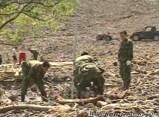中新网8月18日电 据台湾“今日新闻”报道,18日台军官兵持续在高雄县六龟乡新开部落进行地毯式搜索,寻找罹难者遗体。士兵们顶着太阳在土石堆中慢慢嗅闻,并且一一做记号,等着“怪手”来挖。