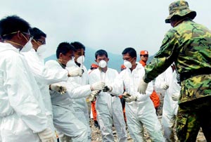“卫生署长”杨志良说,当灾民们看到志工及台军官兵都戴上口罩时,或许心里会觉得怪怪的,但还请大家见谅,因为这也是为了保护灾民。由于甲型流感好发于年轻人,戴上口罩,这也让救灾的年轻士兵多了一层保障。
