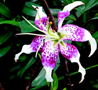 艳红百合花如其名,在原生百合花中最艳丽动人,反卷后翻的白底花瓣带着红色斑点,花蕊往外伸出,远望不像台湾原生百合花,是日本人最喜欢的鹿子百合变种,有“最美丽的东亚百合”之称。