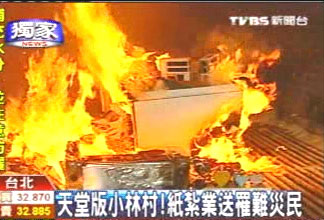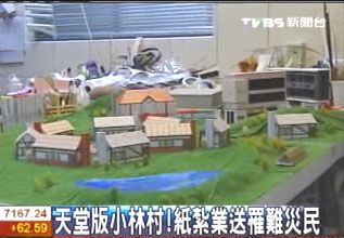 中新网9月4日电 台湾“八八水灾”毁了高雄县小林村,3日正逢中元节,台北县有家专门制作“天堂配件”的纸扎公司,为让死者安息,连夜赶工盖出“天堂版小林村”,里头除了住家、学校以及商店街,希望火化后,能让不幸的罹难者,在天上有栖身之地。