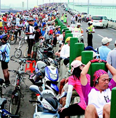中新网9月19日电 据台湾《联合晚报》报道,配合台64号线台北县八里─新店东西向快速道路全线通车,台北县政府举办“大台北国际无车日”活动,清晨4时起来了约七万名单车族,急着想上路尝鲜,却都被挡下来堵在高架桥上。今天天气非常凉爽,但车友们的火气却很大。