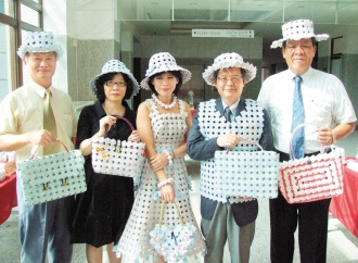 嘉义地检署检察长洪光煊、犯罪被害人保护协会嘉义分会主委陈国华等人,穿、拿、戴着王丽芳用创意以发票编织而成的生活实用品。