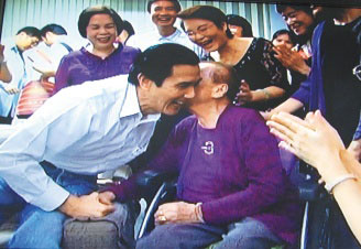 马英九称赞刘成妹讲话很清楚,“了不起”,刘成妹称赞马英九“很英俊”,她请马英九唱歌,马英九唱了儿歌“妹妹背着洋娃娃”,唱完后,自我调侃说“60花甲老翁,唱歌给百岁人瑞听。”