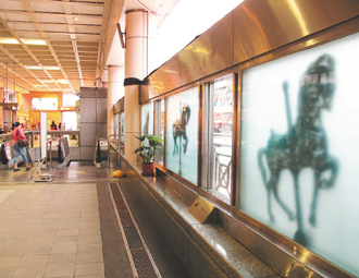 公馆站的“偷窥”,造价395万元,立体投影造型及天花板银幕,因为使用高瓦度灯泡,不易散热,无法久开,还得限定时间欣赏,原本用来让站内外有互动之感,但很多人以为已荒废不用。