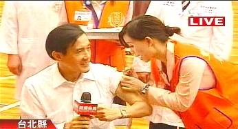 防疫总指挥朱立伦、“卫生署长”杨志良上午率先接种疫苗,为国光所产的疫苗背书,今天下午马英九也卷起袖子来接种,在施打前,县长周锡玮还向马英九保证不会痛,一点感觉都没有,马英九则笑说,怎么可能一点感觉都没有。马英九用行动表示,呼吁民众要对自制疫苗有信心。
