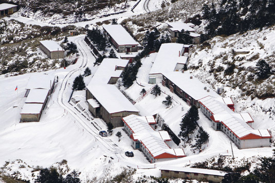 中新网1月6日电 据台湾《联合报》报道,寒流接连来袭,合欢山积雪厚达二十厘米,昨天(五日)山上虽未下雪,但北国风情美景吸引民众涌上山欣赏,一处山谷流水结成冰瀑,瀑柱晶莹,被称为“水晶宫”,是合欢山上最吸睛的雪景。而远处山庄的屋顶彷佛漆上白漆,路面则成了滑雪场。
