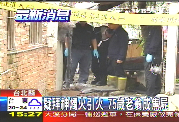 中新网1月29日电 据台湾TVBS报道,台北县芦洲一名75岁的陈姓老翁,上午被人发现陈尸在工棚内,已经成为一具焦尸。消防警察到场勘验,研判工棚可能在凌晨突然起火,老翁逃生不及,才会倒在卧室门口活活烧死,而起火点应该是工棚旁供奉神明的棚架,疑似烛火倾倒引发火势,导致老翁丧命。