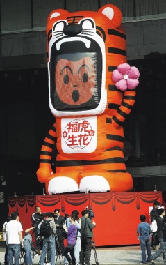 中新网2月11日电 据“中央社”报道,2010台北灯节26日起一连举行10天,除传统花灯外,台北市政府文化局今年结合当代艺术,规画“公共艺术灯区”,在市府大楼门前及上方放置2只可爱的“开心福虎”,并将征募6666位民众的大头照,在灯节期间投影在台北市政大楼的外墙上。