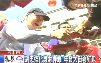 再过几天就是农历春节,台中天津路年货大街为了增加人气,请胡志强发红包,民众大排长龙,不少小朋友领到市长红包,嘴巴也变甜了,“祝市长新年快乐,年年有余,大吉大利!”还有一位阿伯为了见到胡志强,连续3年都来领红包。