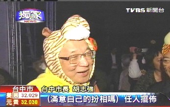 台中市长胡志强扮成老虎,并围上一条“老虎围巾”,所有参加台中灯会的贵宾坐在位子上整齐划一,不论穿的是西装还是休闲服,都在脖子上加了条亮黄色围巾……这是台中市府的创意,围巾左右两边是老虎尾巴,做成英文字母T,代表台中Taichung,还有老虎Tiger。