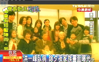中新网2月26日电 据TVBS报道,宝岛歌王洪一峰,日前因胰脏癌病逝。25日晚间,他的家人提供了除夕当天晚上,家族全部聚一起到病床前,连日本的妹妹都赶回来,和洪一峰一起迎新年的画面。这也是从去年底,洪一峰住进医院到过世以来,唯一曝光的画面。