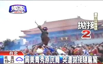 中新网3月2日电 据台湾TVBS报道,马英九夫人周美青1日欣赏音乐剧演出,一时兴起,亲自跳起少数民族舞蹈。周美青跳舞跳得忘情,还四度被舞者抛向天空,让现场民众见识周美青活泼的一面。
